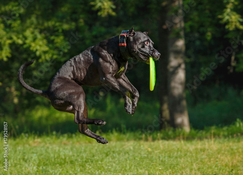 dog, pet, purebred, american, pitbull, terrier, black, shiny, sport, fun, play, jump, enough, flying, drive, green, lawn, grass, forest, summer, day, closeup