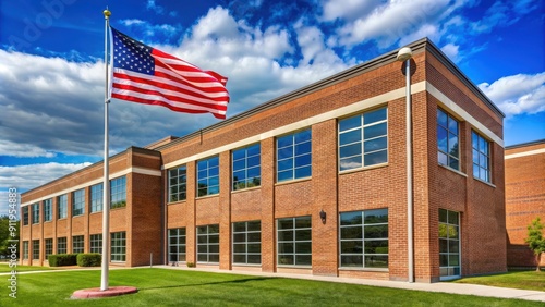 American school building exterior with brick walls, large windows, and a flag flying outside, school, building