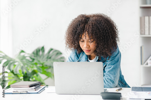 American teenage woman sitting in white office with laptop, she is a student studying online with laptop at home, university student studying online, online web education concept.