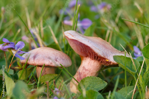 Amethyst deceiver mushrooms grows in blooming purple violets.