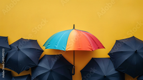 Amidst a collection of black umbrellas, a single rainbow umbrella is prominently visible, set against a minimalist, solid color background. The ample copy space emphasizes the umbrella's bright