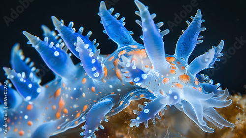 Amidst icy depth of North Pacific intricate beauty of blue dragon sea slug revealed through lens of macrophotography setup Using specialized lighting technique iridescent hue delicate cerata of rare