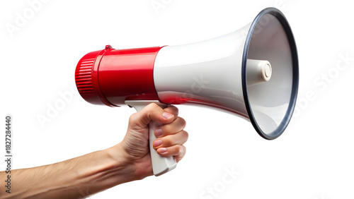 Amplify your message with this vibrant red and white megaphone held confidently, perfect for announcements, promotions, or powerful communication