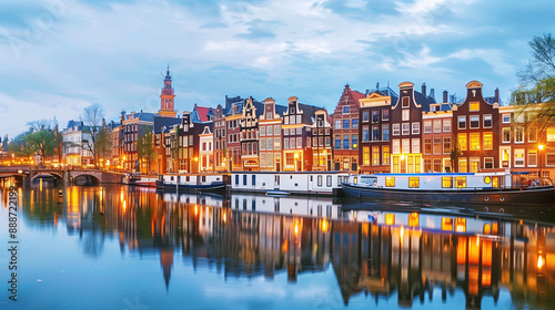 Amsterdam’s canals and historic buildings softly illuminated by early morning light