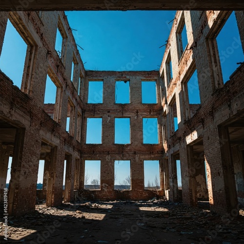building, abandoned, ruin, window, brick, sky, empty, destruction, architecture, decay, derelict, structure, shadow, frame, blue, broken, urban, exposure, light, sun, crumbling, war, openness, space, ruin, floor, history, remnant, survival, desolation, emptiness, isolation, forgotten, hollow, disaster, devastation, industrial, weathered, collapsed, barrenness, aftermath