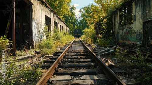 An abandoned railway track surrounded by trees and overgrown vegetation, with a dilapidated building in the background.