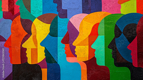 An abstract artwork of colorful overlapping profiles, symbolizing unity in diversity and global harmony. Perfect for World Peace Day campaigns, cultural inclusivity projects, and inspirational designs