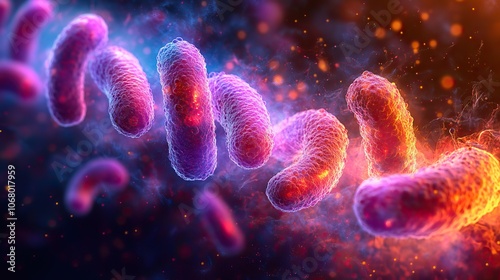 An abstract background showcasing microbiome organisms, lactic acid bacteria, and probiotics, emphasizing the importance of bacterial flora in human health and medical research.