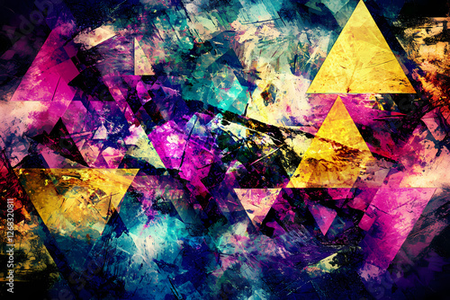 An abstract digital collage featuring colorful triangle shapes on a dark background, creating a dynamic and vibrant composition.