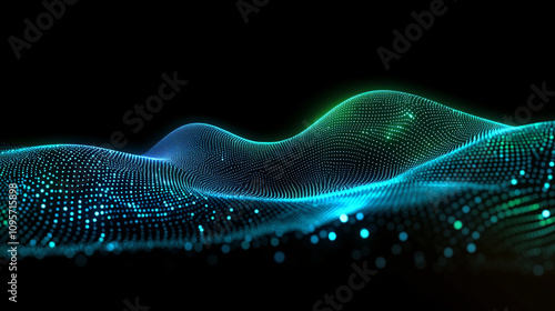 An abstract gradient hologram dynamic wave of Futuristic network of green glowing connections. particles on a black background. Digital sound, music, or futuristic wallpaper technology background.
