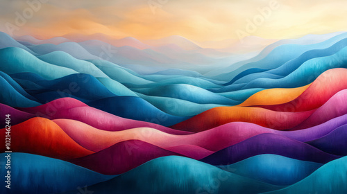 An abstract landscape of rolling hills in vibrant shades of fuchsia and aqua,