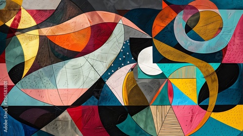 An abstract painting with interwoven shapes and patterns in bold, contrasting colors.
