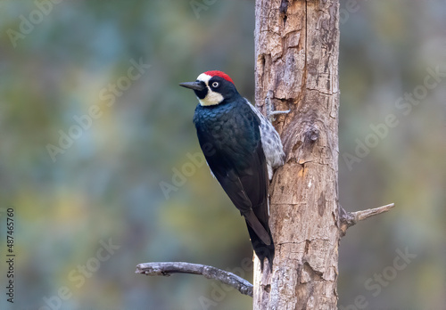 An acorn woodpecker watches behind itself from a dead tree