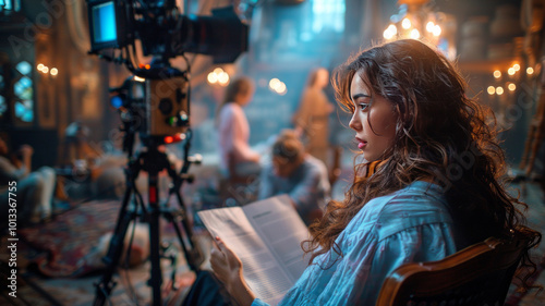 an actress sitting on a chair in a movie set, holding and reading a script in one hand.