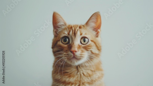 An adorable orange tabby cat looking curiously at the camera, set against a soft grey background