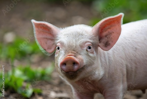 baby pig, pig, animal, young, baby, cute, pink, curious, snout, ear, farm animal, mammal, agriculture, farming, portrait, outdoors, nature, rural, dirty, muddy, domestic, gaze, looking, head, face, adorable, innocent, small, creature, sweet, charming, candid, closeup, daylight, natural light, skin, expressive, swine, endearing, playful, alert, healthy, bokeh, foliage, earth, observant, happy