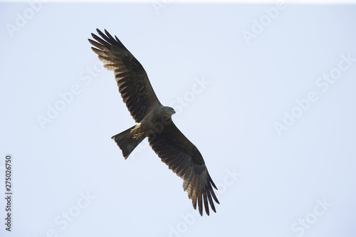 An adult female European black kite (Milvus migrans) soaring and calling in the sky.