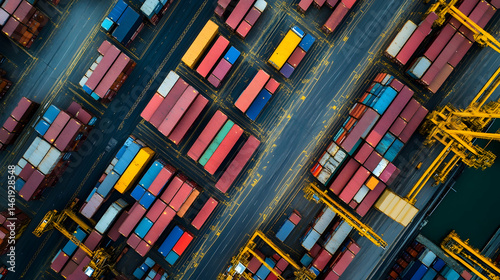 An aerial view of a busy shipping port with rows of colorful shipping containers