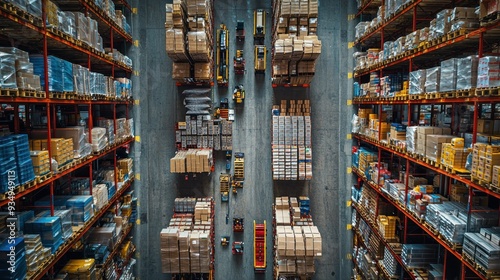 aerial, view, large, warehouse, facility, extensive, layout, storage, shelf, tied-up, activity, men at work, equipment, floor, image, scale, operation, systematic, arrangement, good, importance, logistic, organisation, managing, distribution, center