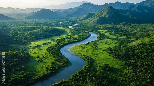 An aerial view of a meandering river cutting through a lush green valley, its winding path creating a stunning natural landscape