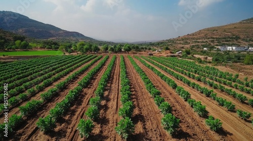 An aerial view of a reforestation project in action, with rows of newly planted saplings stretching across the landscape, highlighting efforts to combat deforestation