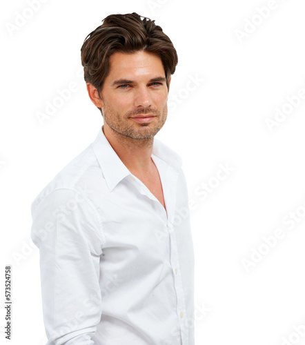 An aesthetic and attractive young male beauty model posing in a fashion contemporary looking handsome in a formal shirt style isolated on a png background.