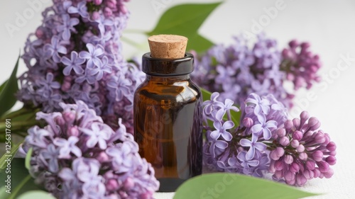 An aesthetic arrangement featuring an amber glass bottle surrounded by blooming lilacs, evoking a soothing and floral ambiance.