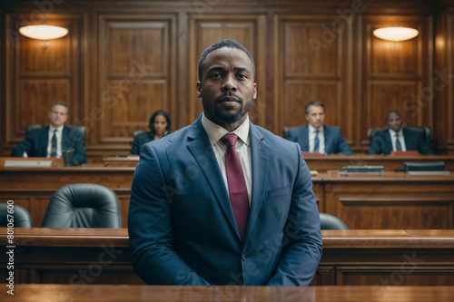 An African-American lawyer stands before a jury in defense of his client. Court and trial