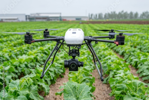 An agronomist drone soars above an expansive farm field with crops, generated using AI.