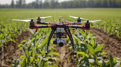An AI drone scanning agricultural fields, collecting data to optimize crop yields.