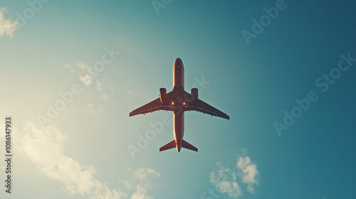 aeroplane, plane, aircraft, flying, air travel, travel, sky, cloud, sun, afternoon, landing, approach, view, perspective, red, flight, aviation, transportation, journey, up high, below, cloudscape, airliner, jet, altitude, wing, engine, overhead