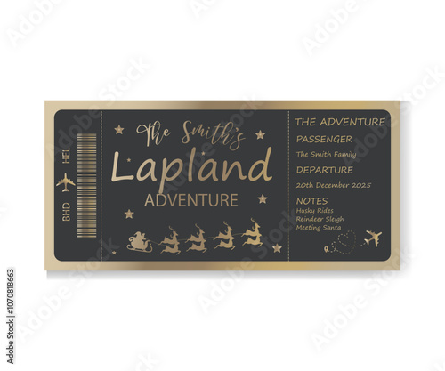 An airplane golden ticket. Christmas ticket with Santa and reindeer. Printable vector image
