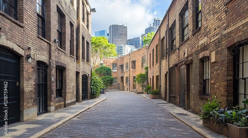 An alleyway in an industrial area of Sydney, with brick buildings and cobbled streets, has a cinematic feel