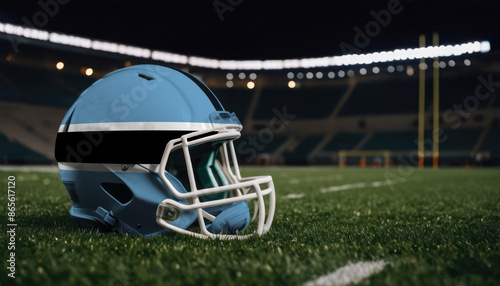 An American football helmet with the Botswana flag design sits on a field at night, under stadium lights