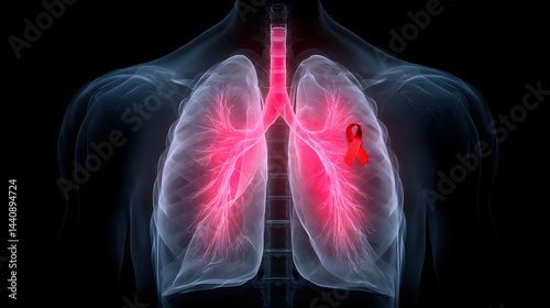 An anatomical representation of human lungs highlighting their structure, with a red awareness ribbon symbolizing health and support.