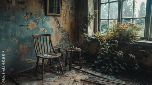 An ancient wood chair and a dilapidated table stand in the middle of the abandoned room, surrounded by layers of dust and the echoes of forgotten conversations