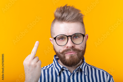 An angry young stylish man in glasses with a mustache and beard shows middle finger posing on a yellow background. Concept of denial and annoyance.