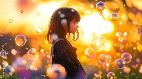 girl, bubble, sunset, light, field, sky, anime, hair, short, sunlight, dress, uniform, colours, dream, summer, soap, sphere, iridescent, refraction, background, soft, blurry, bokeh, glow, beautiful, peaceful, serene, outside, nature, landscape, scene, tranquil, gold, orange, yellow, rose colored, profile, side, view, face, expression, happy, joy, cheerful, play, whimsical