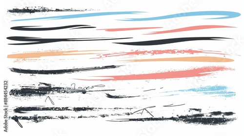 An array of abstract brush strokes in various shades of black, blue, red, and orange on a white background. Ideal for creative and artistic ventures and design concepts.