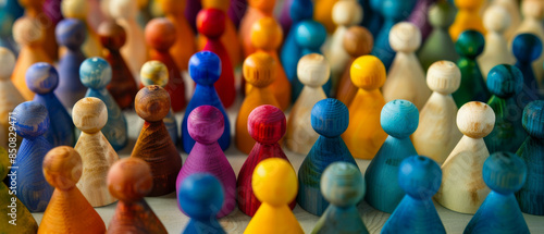 An array of colorful wooden figurines stands on display, representing diversity, community, and the beauty of individuality within a collective gathering.