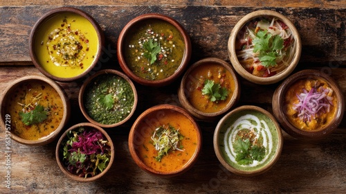 An array of vibrant bowls filled with colorful, delicious soups, highlighting diverse culinary traditions.