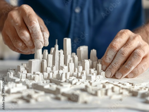 An artist meticulously creates a detailed architectural model, showcasing urban design and craftsmanship with white materials.