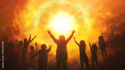 An artistic, glowing sunrise over a silhouette of children reaching towards the light.