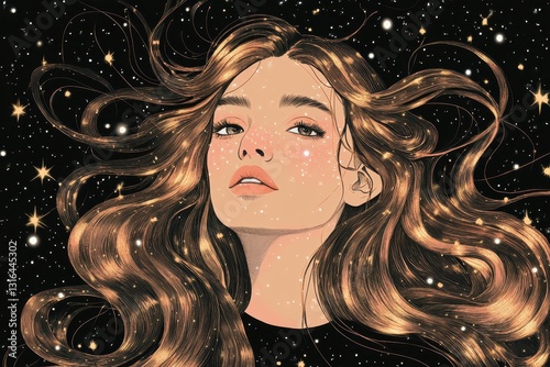 woman, portrait, illustration, art, hair, long, wavy, brown, face, eye, lip, nose, skin, celestial, starry, night, cosmos, glow, light, sparkle, star, dark, black, beauty, fantasy, surreal, galaxy, space, drawing, digital, render, artwork, figure, graphic, design, aesthetic, dreamy, aethereal, shine, glistering, highlight, background, elegant, cosmic, mysterious