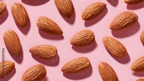 An artistic overhead shot showcasing numerous almonds scattered across a pink surface. The almonds are raw, shelled, and ready for use in cooking or snacking