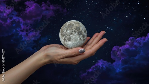 An artistic shot of a hand with a moon model at night, showcasing nature, sky, and celebration