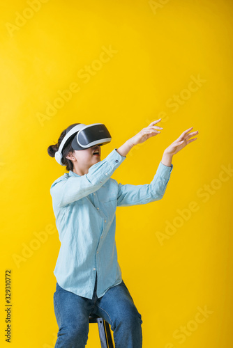 An Asian girl using VR glasses in front of a yellow background