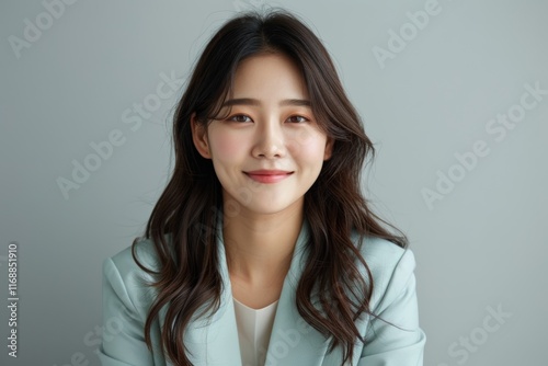 An Asian woman in a pastel green suit smiles warmly at the camera, her confident stance highlighted by the cool, grey-green studio background.