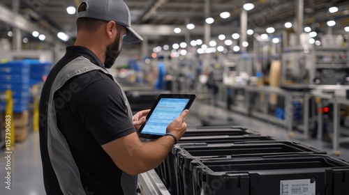 assembly, line, marked, asset, men at work, tablet, check, status, update, location, real, time, innovation, efficiency, tracking, productivity, connectivity, management, monitoring, optimization, manufacturing, business, engineering, automation, environment, factory, concept, industry, control, green, technician, system, energy, manufacture, modern, technology, automated, smart, factory, robotic, cyberspace, thing, sustainable, agile, efficient, robot