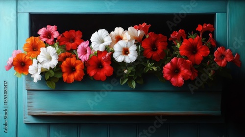 An assortment of blooming petunias in rich colors creates a vibrant flower box that brightens any garden, showcasing the beauty of nature and artistic floral arrangements.